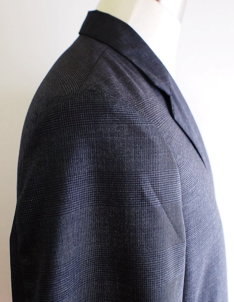 色合いはチャコールグレーとブラックのとても細かなグレンチェック、素材混率は毛100%です