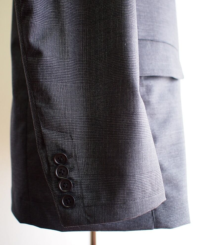 左胸には箱ポケット、左右腰にはフラップ付き片玉縁ポケット、裾と袖口は三つ折りステッチ、袖口は4つボタンの本切羽開き、後中心裾にはセンターベント