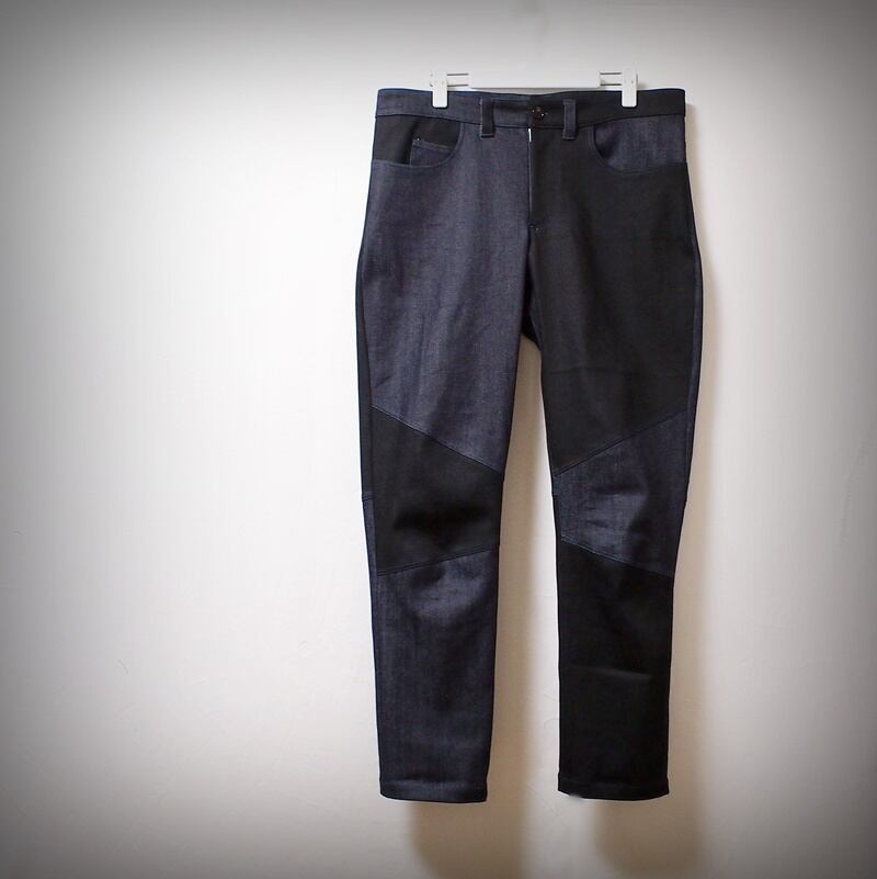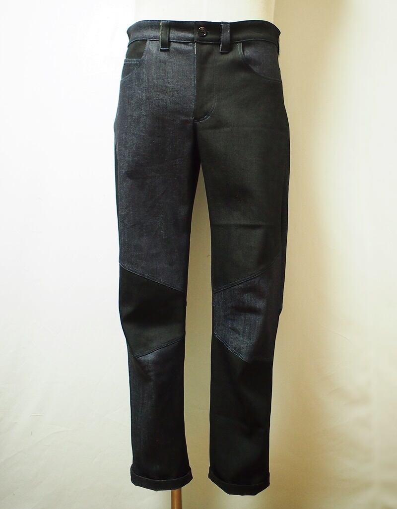 このパンツと同じ素材のインディゴとブラックを使用し、パターンを若干修正したクレイジーパターンのテーパードライダースパンツ