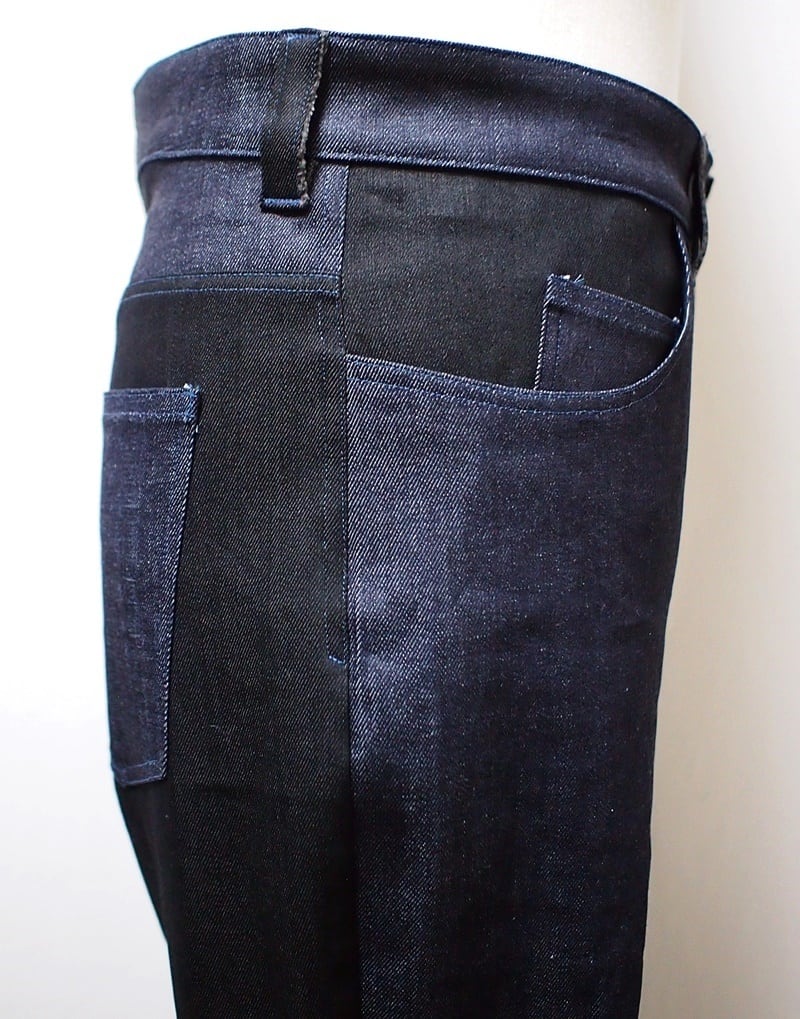 パンツのパーツ全てが左右アシンメトリーなインディゴデニムとブラックデニム