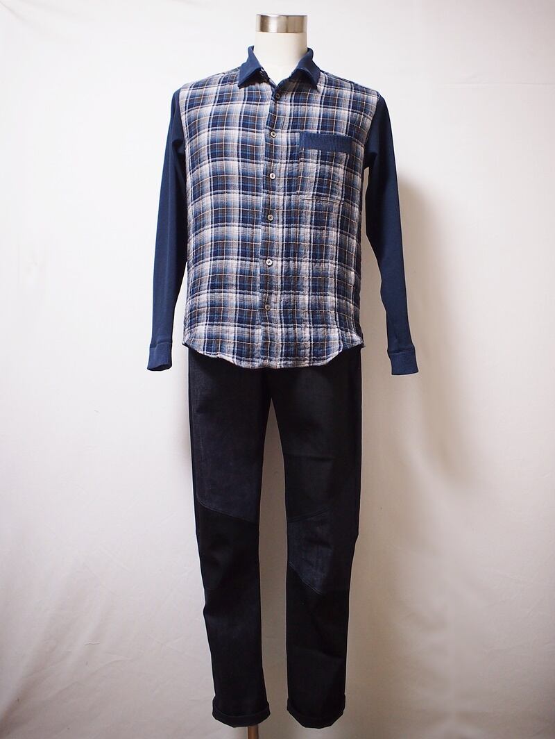 ストレッチの効いたインディゴデニムとブラックデニムを互い違いに配したクレイジーパターンの5ポケットパンツ