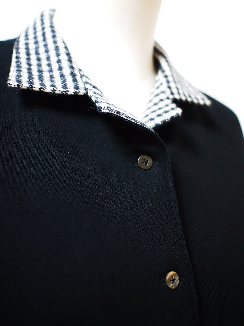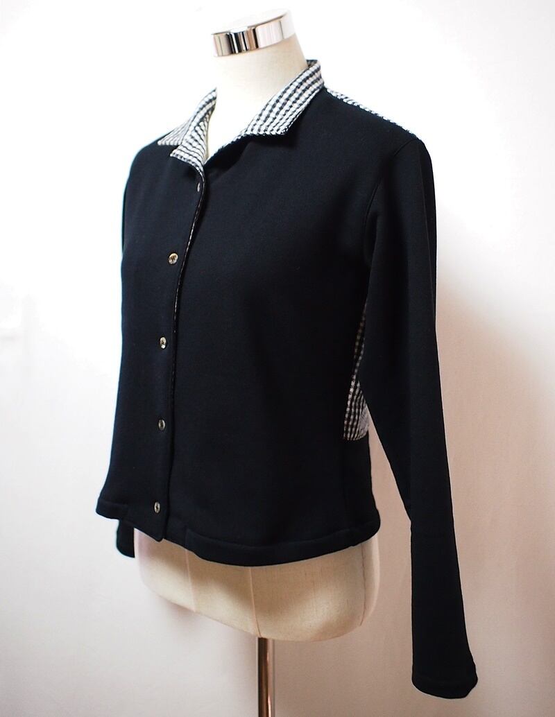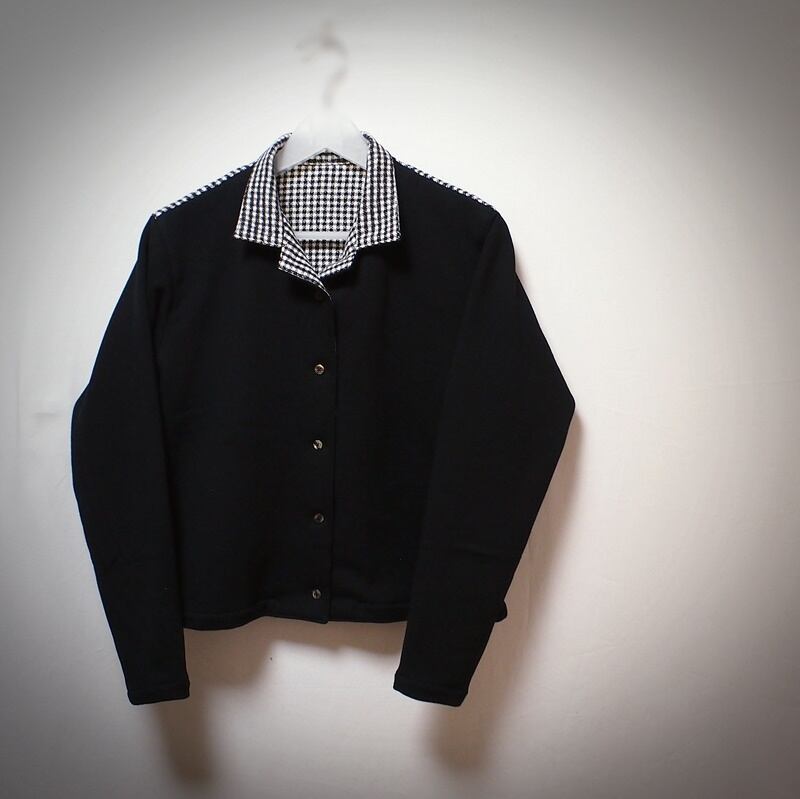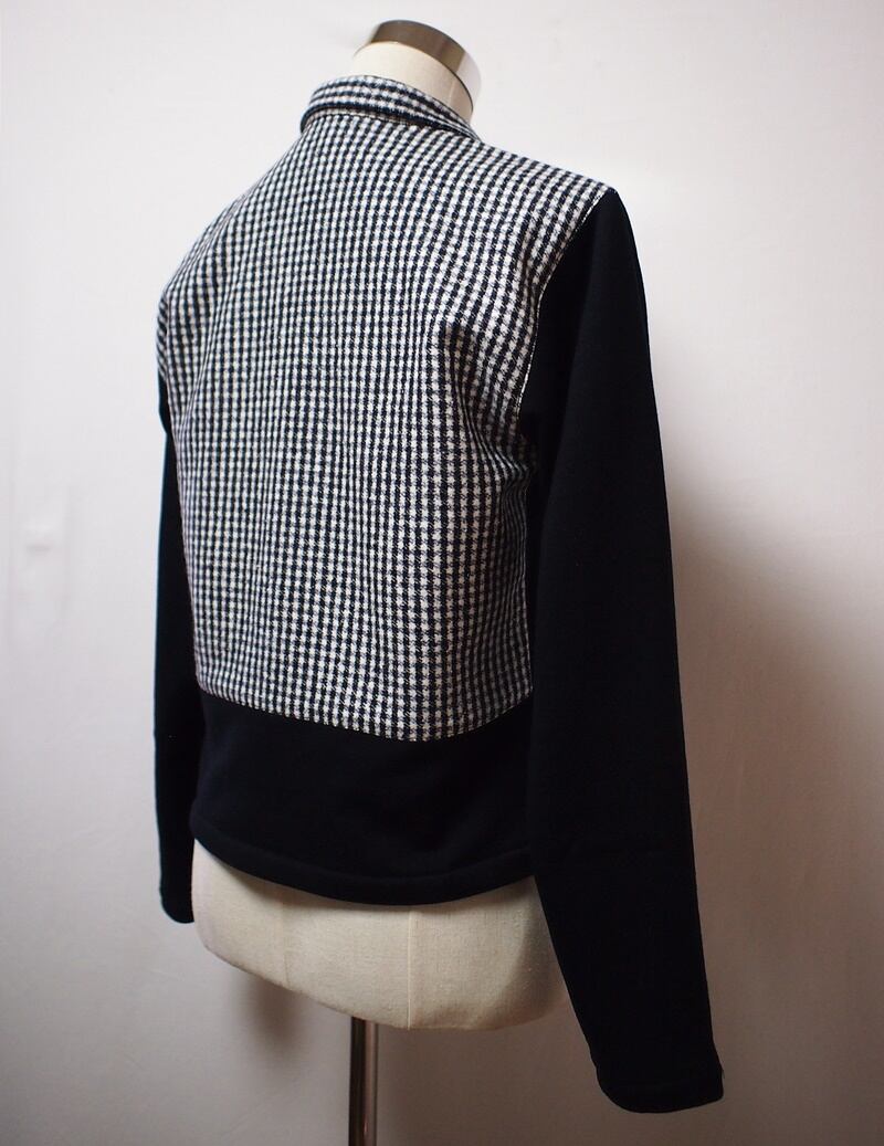 前身頃と後身頃の下側、袖に真っ黒なミニ裏毛 後身頃の上側と衿、前後身頃の見返しへ千鳥格子のフランネル