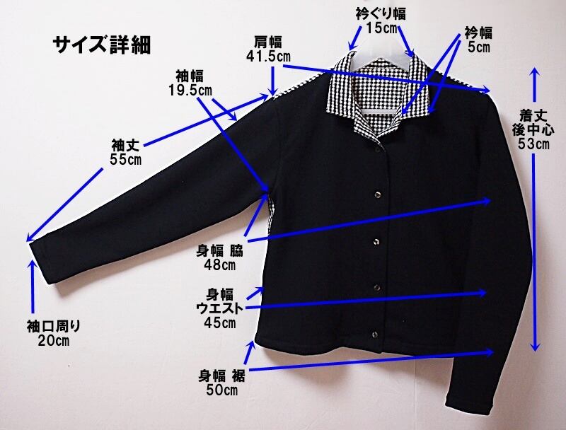 身幅は脇で48㎝、ウエストで45㎝、腰50㎝、肩幅は41.5㎝でちょっとコンパクト、着丈は後中心で53㎝