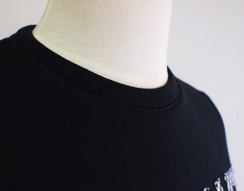 使用しているのは綿100%の真っ黒なミニ裏毛、一般的な裏毛素材よりも裏側パイルのループが小さく細い糸で編まれた軽いスウェットジャージー
