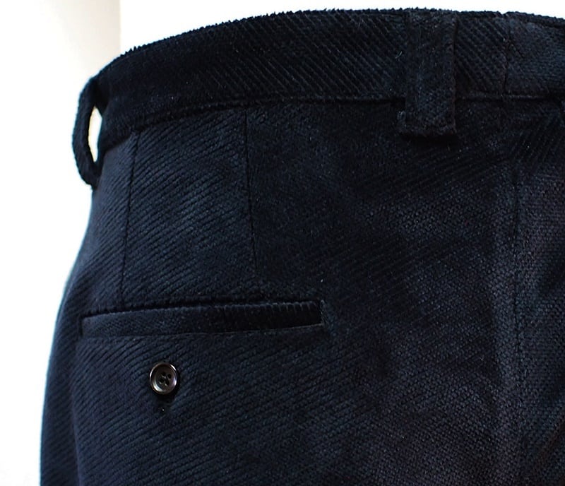 厚みがあり、伸縮性高く、畝が控えめな表情の生地、黒に近い色合いのダークネイビー