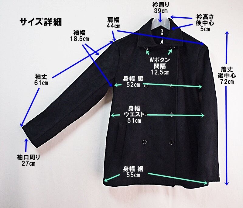 着丈は後中心72㎝、肩幅44㎝、袖丈61㎝、身幅は脇で52㎝、ウエストで51㎝、裾で55㎝、ゆとりあるサイズ感