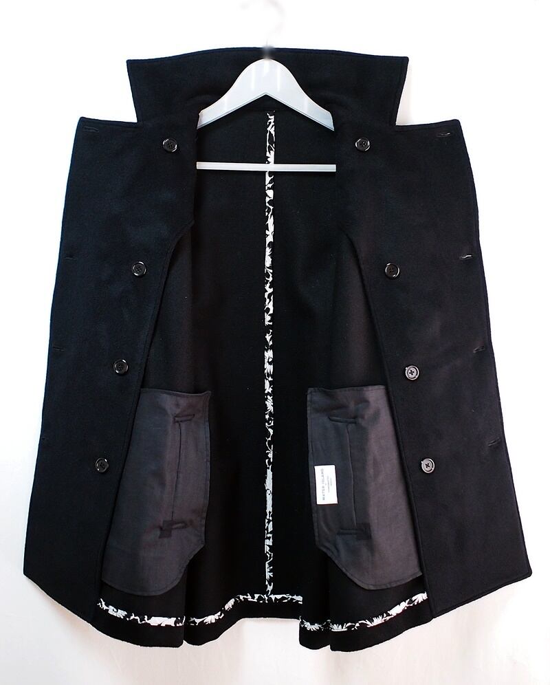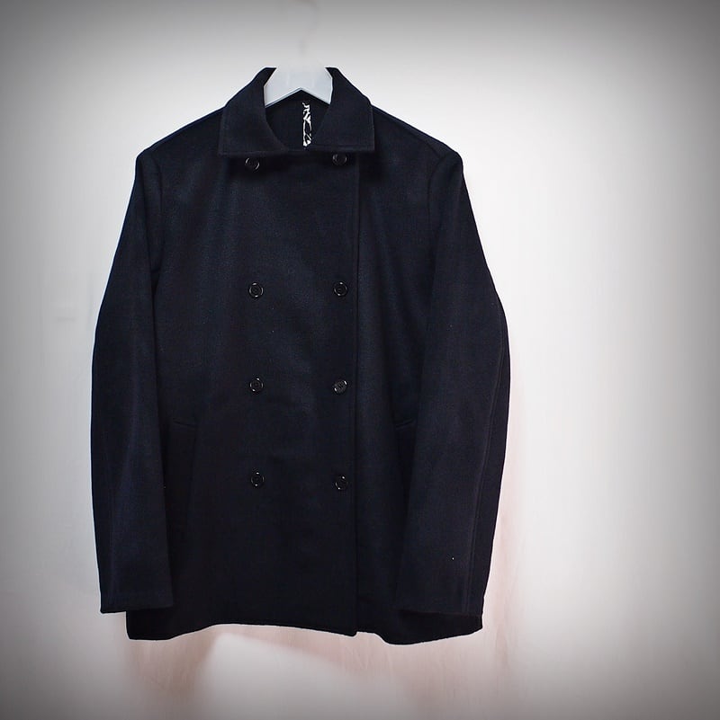 高い衿腰でコンパクトな衿幅、深いラペルのダブルブレストで左右前身頃の表裏にボタン、前打ち合わせを左右どちらでもすることが可能です