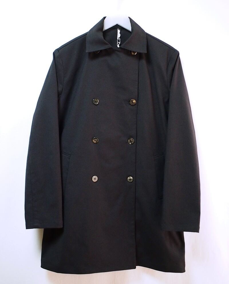 春らしい素材で作ったダークカラーのダブルブレストハーフコートです。