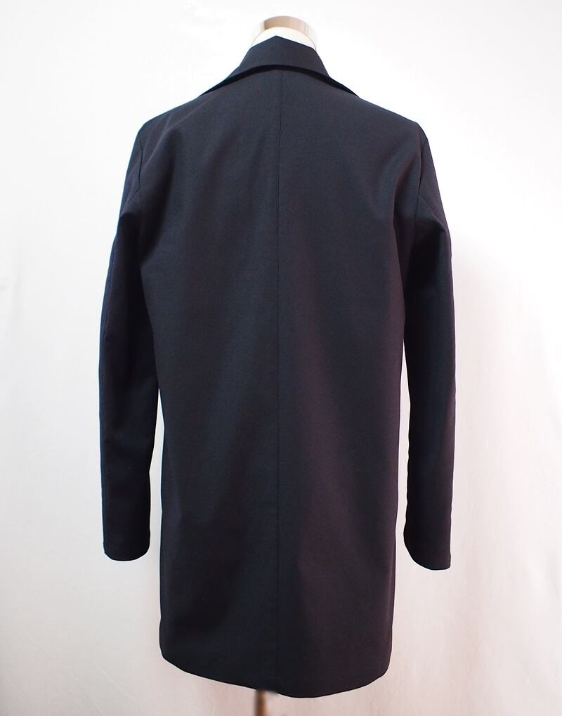 肩パッドは入れずにシンプルなデザインのセットインスリーブ、左右腰にはハンドウォーマータイプの箱ポケット、裾周りと袖口の仕様は三つ折りステッチ