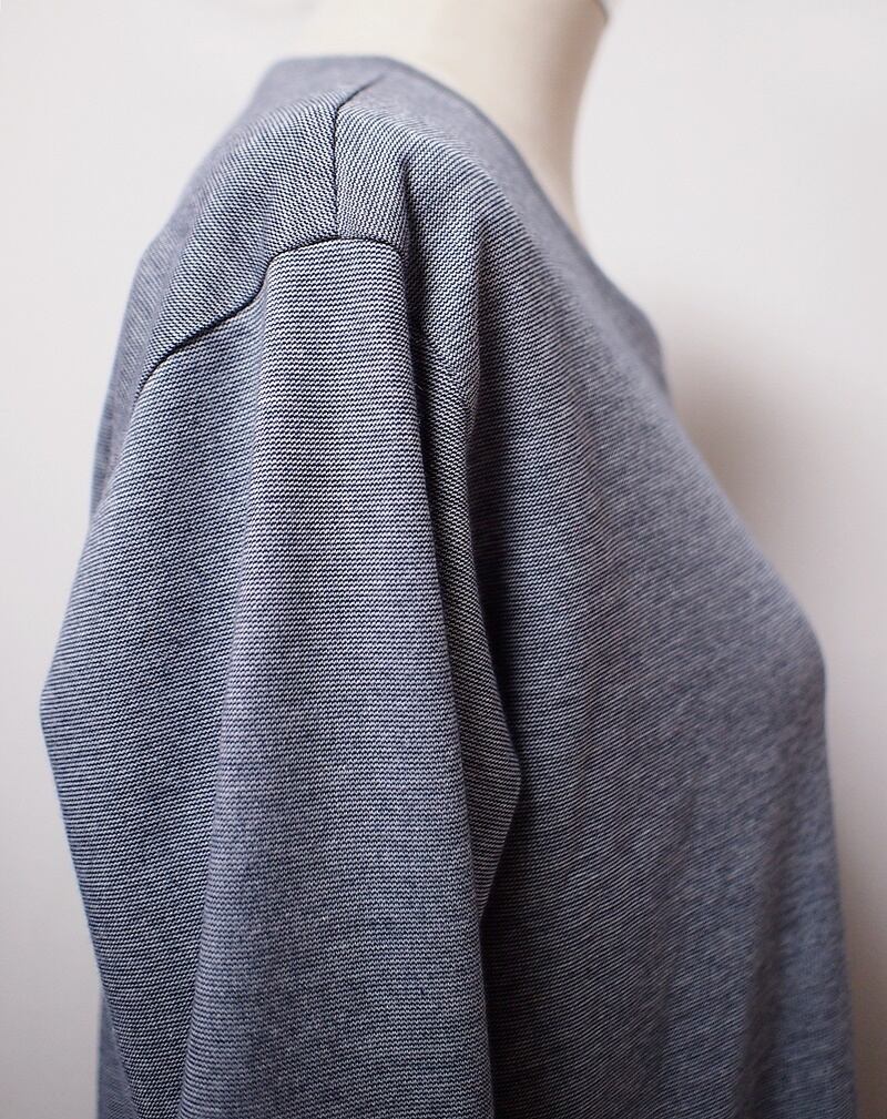 衿ぐりは1.5㎝幅のバインダー始末で衿ぐり周りは約59㎝、袖口と裾の始末は端ロックして折り返しステッチ