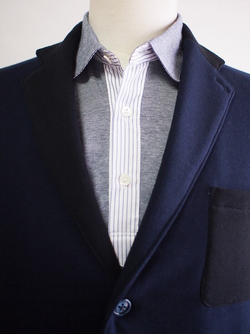Wペンシルストライプの安定感ある肩ヨーク切り替えで上衿を立てるとWペンシルストライプがクローズアップ!
