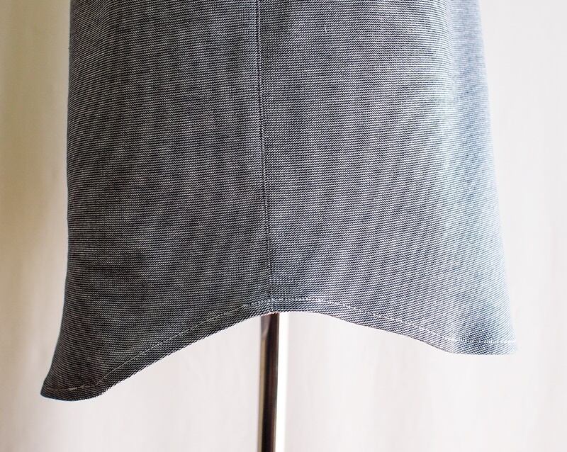 ラウンドカットの裾と袖口は端ロックして二つ折りステッチ、袖下から脇、袖ぐりは端ロックして片倒しコバステッチ仕様