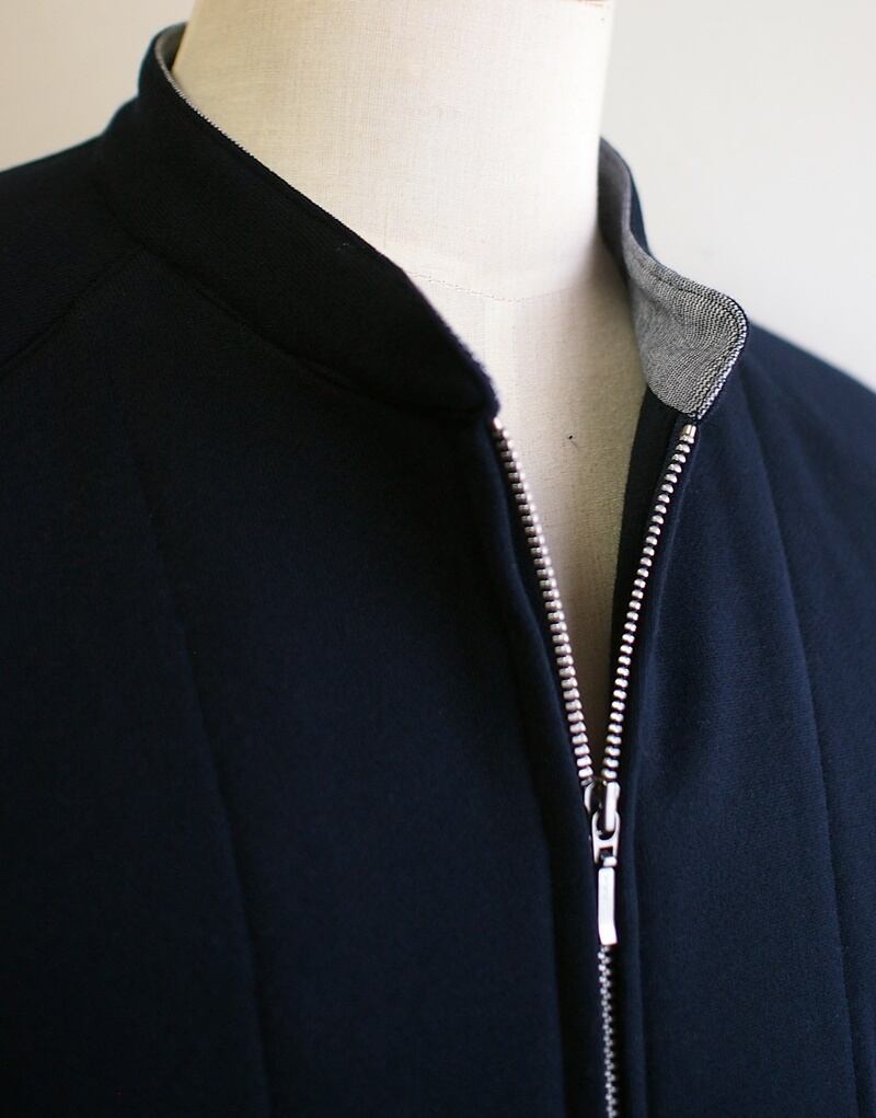 左右両腰にはハンドウォーマーポケット、ポケット口布に綿100%で濃紺の別布(布帛)を使用、スタンドカラー衿裏にコットンポンチミジンコボーダーを配色使い