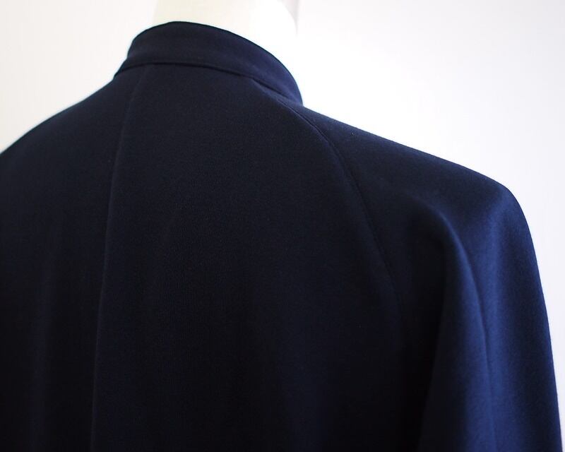 前中心はフルジップアップ、衿の高さが後中心で3.5㎝のスタンドカラー、ラグランスリーブでゆったりとしたシルエットのハーフコート