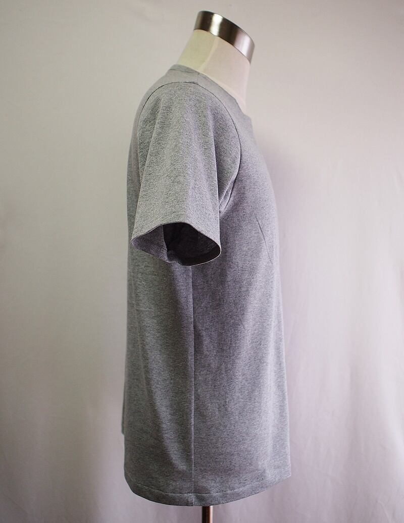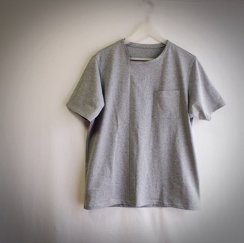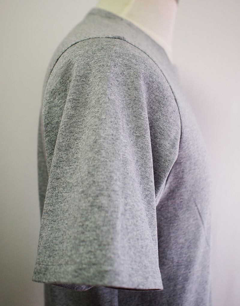 白とグレーの杢糸で編まれた14/-チャンピオン天竺のアシンメトリーネックでポケット付けた半袖Tシャツ