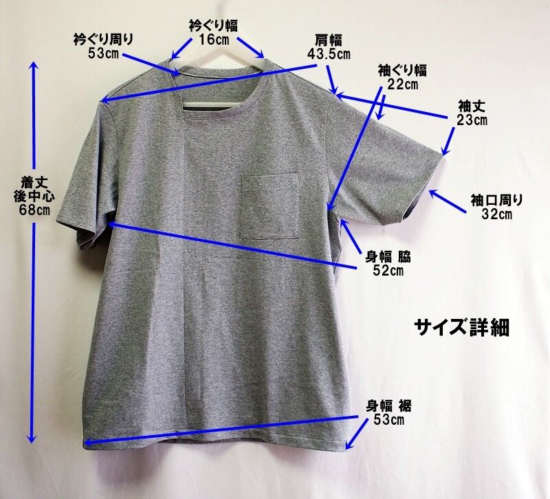 肩幅43.5㎝、袖丈23㎝のショートスリーブ、着丈68cm、身幅は脇で52㎝、裾53㎝でLサイズくらいのサイズ感