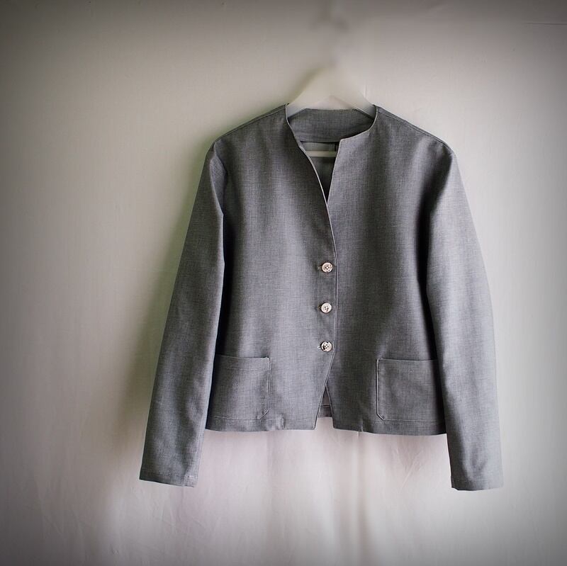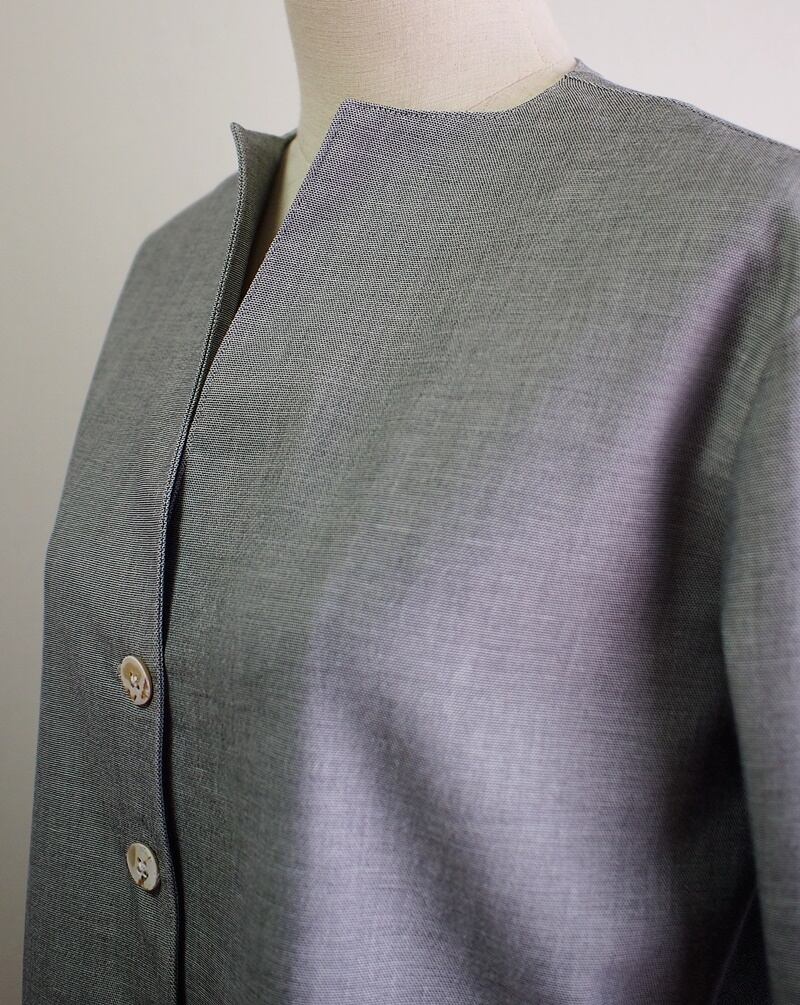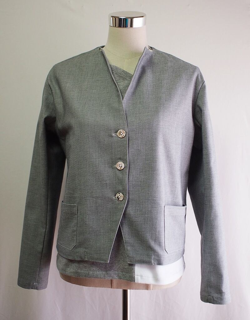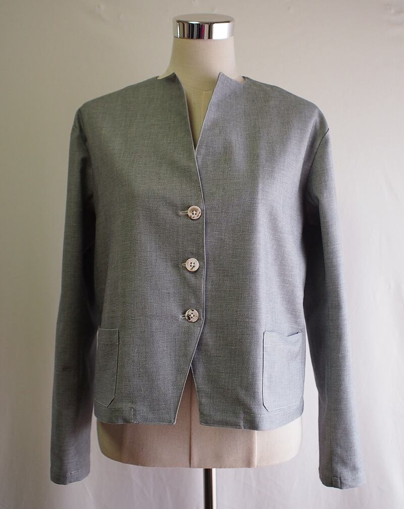 個性的な衿ぐりのシンプルなノーカラージャケット、ラウンドネックのノーカラーでテーラードラペルのようなVゾーン