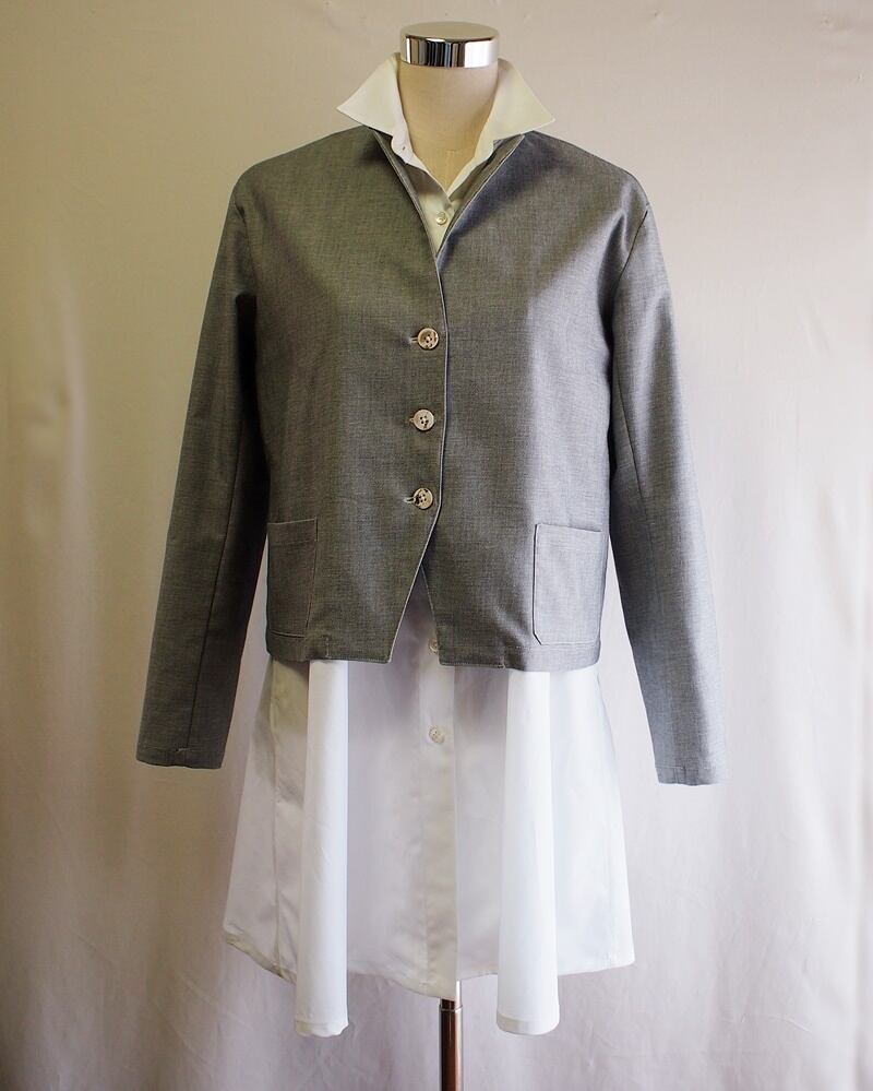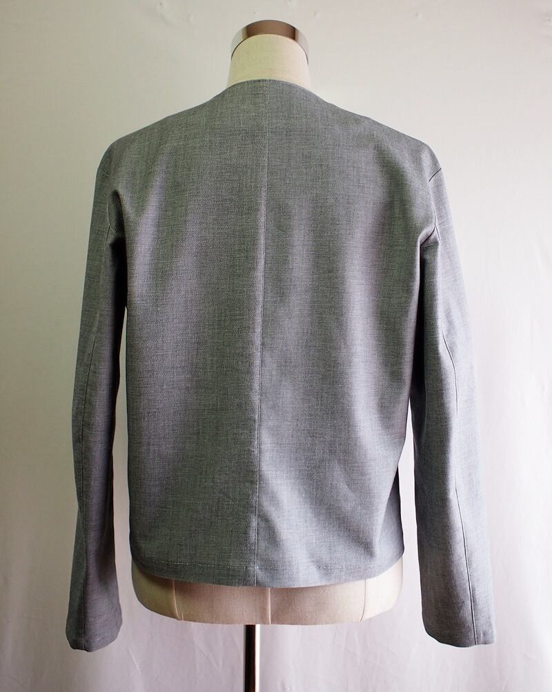 裏側は前見返しと小さな後見返しの背抜き仕立て、袖裏無し、縫い代は端ロック片倒しでコバステッチ、裾と袖口は三つ折りステッチ