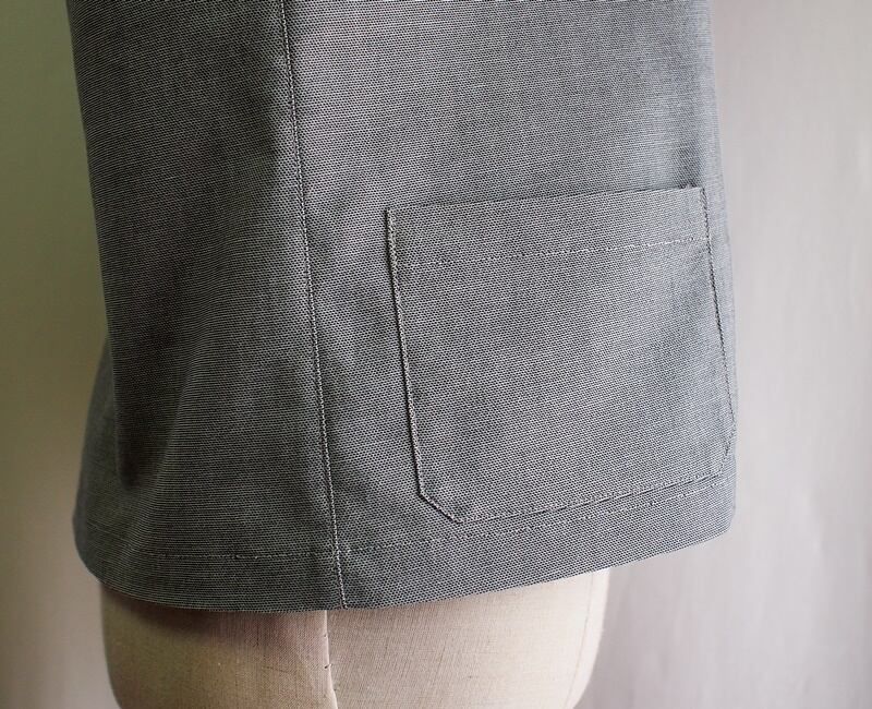 着丈やや短めで腰に小さいパッチポケット、身体を締め付けない程度にウエスト絞ったゆとりあるシルエット