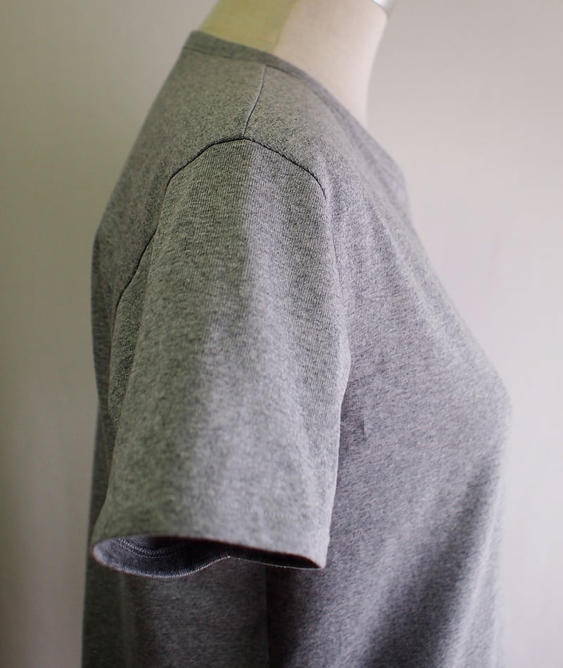 肩、袖ぐり、袖下から両脇などシーム(接ぎ目)は地縫いして端ロック片倒し、袖口と裾は端ロックして二つ折りステッチ仕様