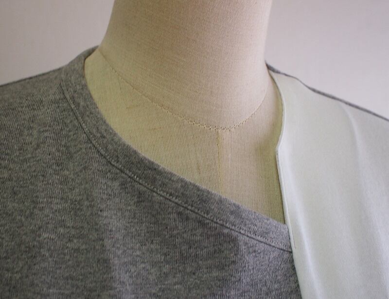 Vネックのような傾斜の右側の衿ぐり、左前衿ぐりには見返しを付けて衿ぐり端にコバステッチ、左袖だけが真っ白なバックスタイル