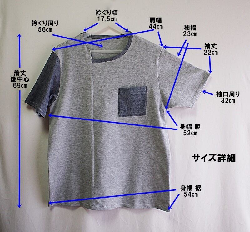 肩幅44㎝、袖丈22㎝のショートスリーブ、着丈69cm、身幅は脇で52㎝、裾54㎝、Lサイズくらいのサイズ感