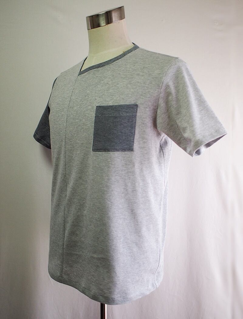 たった一つの…メンズ☆ストレッチ鹿の子×コットンポンチ☆バイカラー☆アシンメトリーネック☆ポケットT☆Lサイズ☆トップグレー&ブルー系