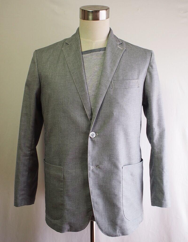 前身頃右寄りに衿ぐりから裾へ縦のシーム(接ぎ目)で切り替え、前身頃左側にパッチポケット
