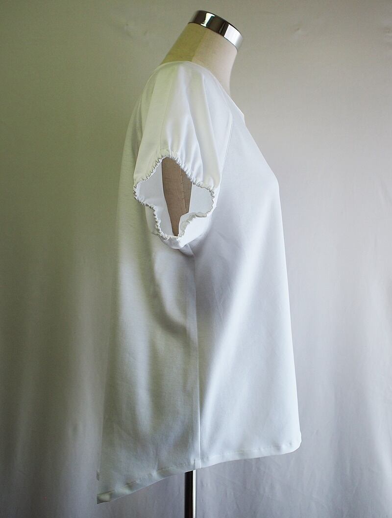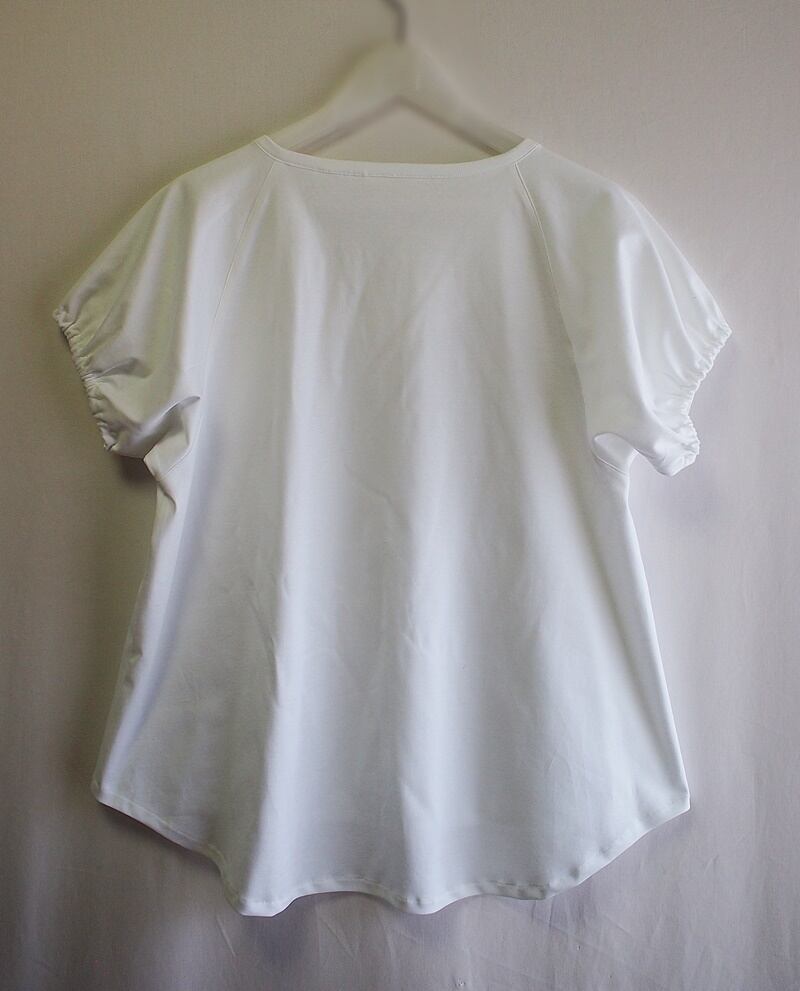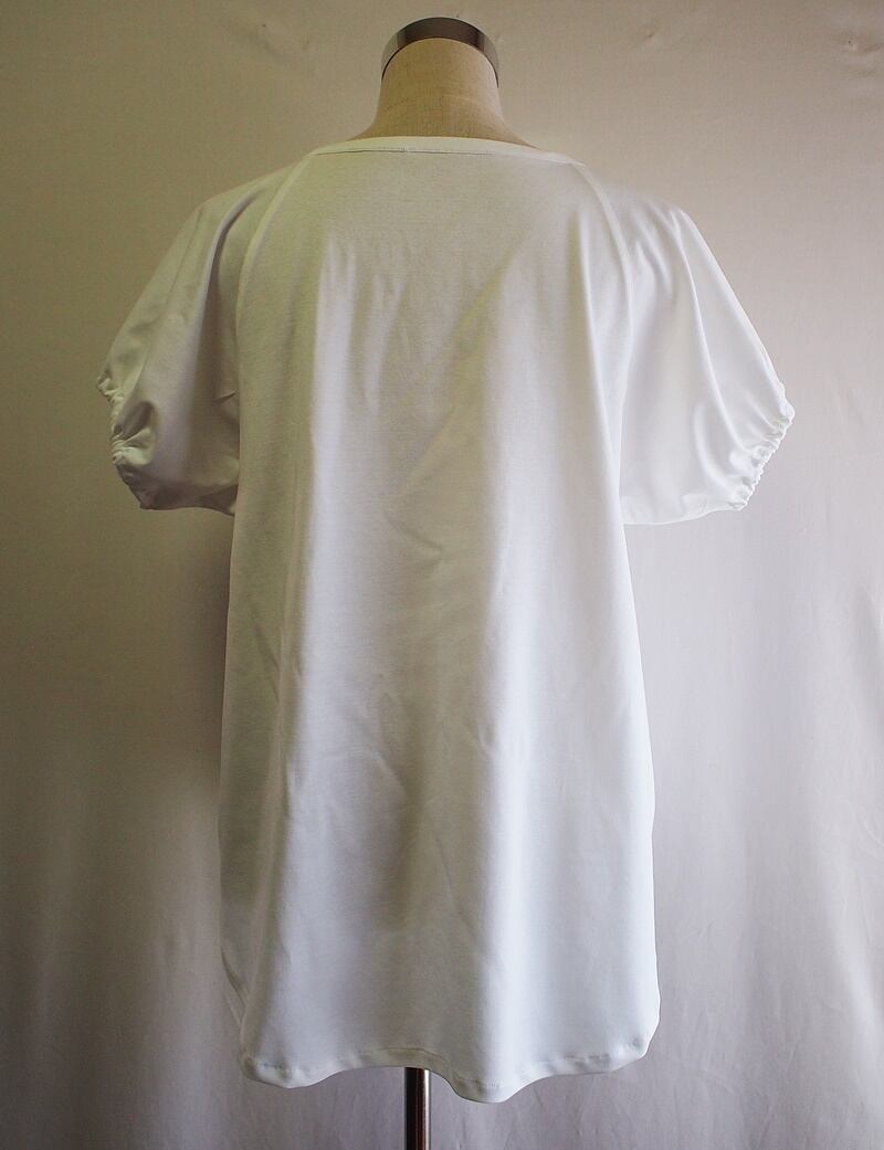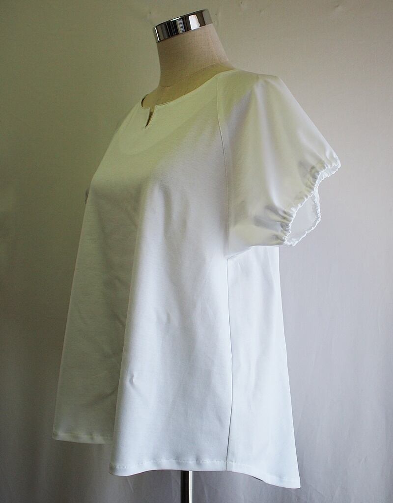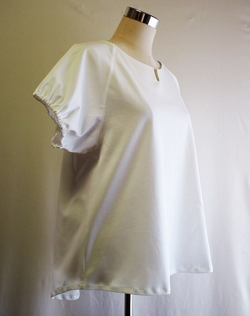 衿ぐりから斜めに切り替えたラグランショートスリーブで袖口にゴム紐入れてシャーリングしたパフスリーブ