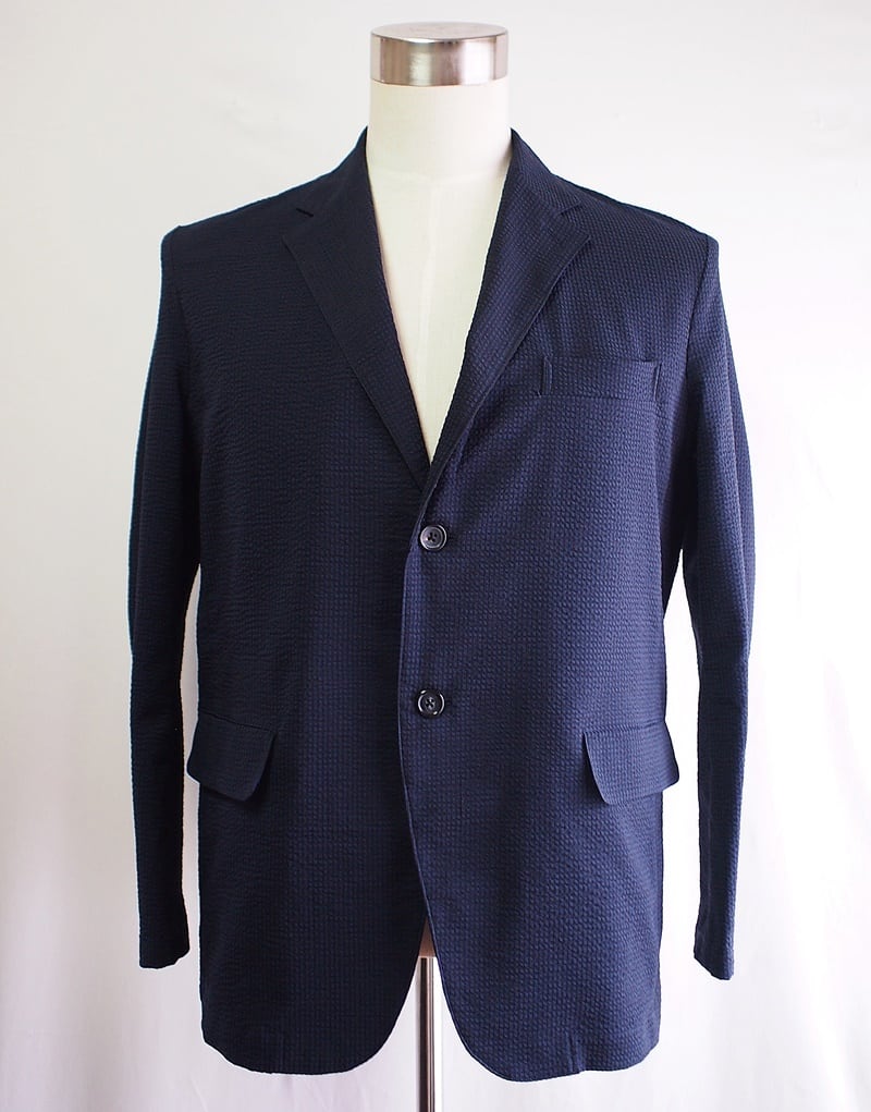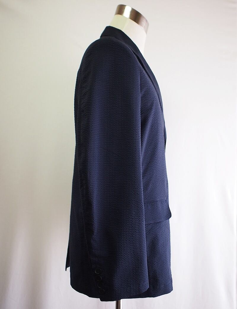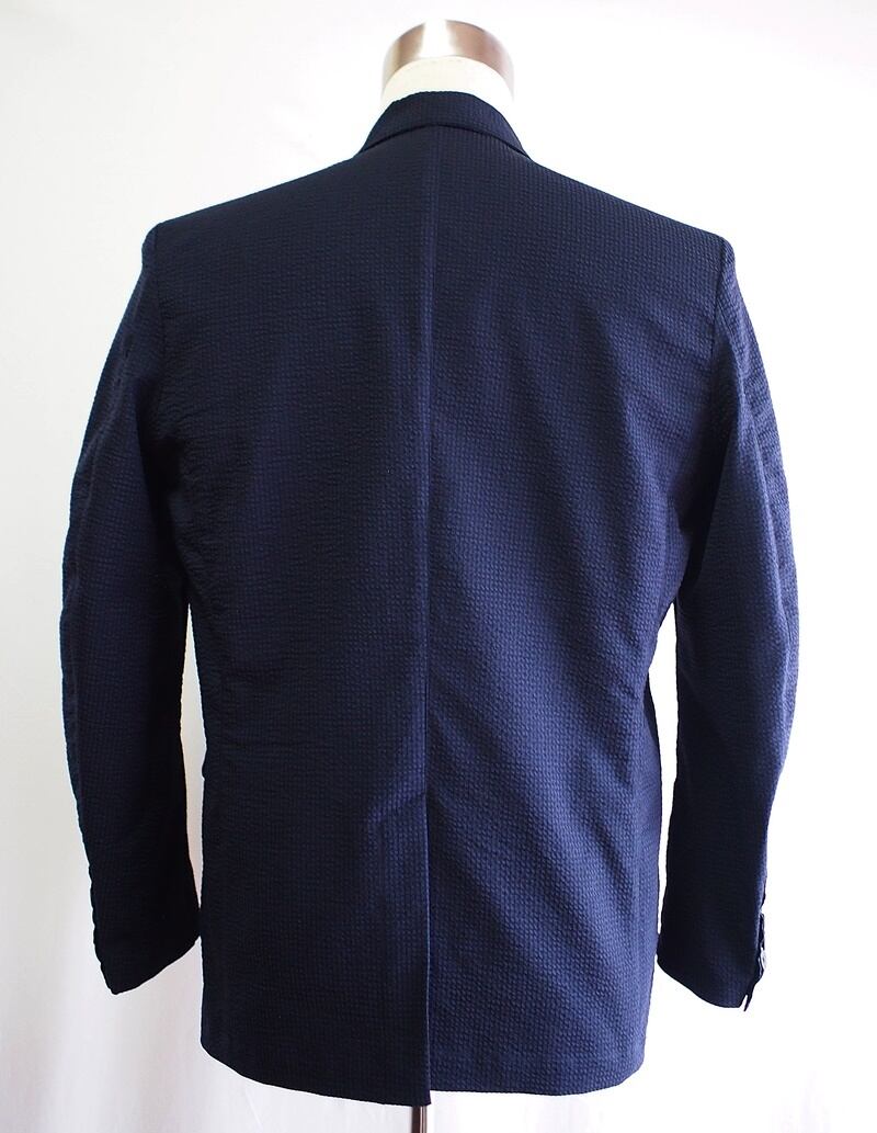 セール60%オフ!たった一つの…メンズ☆C/Pe/Pu混☆ストレッチサッカー☆テーラードジャケット☆Lサイズ☆ダークネイビーピンチェック