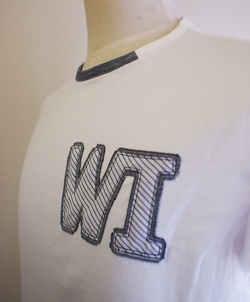柔らかなコットンフライスのWIロゴアップリケのバイカラークルーネックT