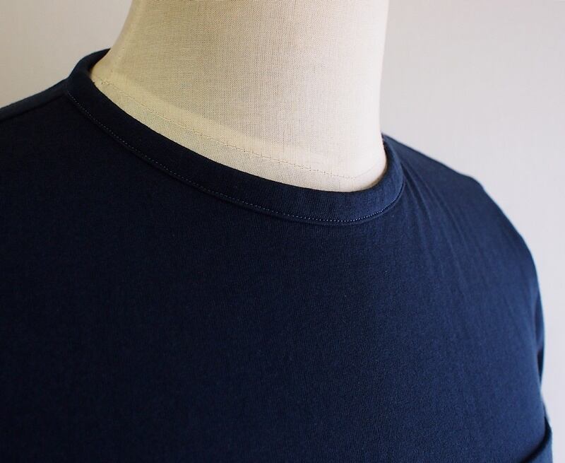 使用したのはオーガニックコットンの17/-BD天竺、空気の風圧で撚りをかけた空紡糸で編まれた天竺ジャージー