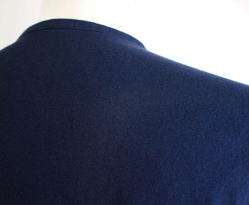 衿ぐりは共布で挟み込むバインダー(1㎝幅)始末、肩、袖ぐり、袖下から両脇などシーム(接ぎ目)は地縫いして端ロック片倒し、袖口と裾は端ロックして二つ折りステッチ仕様