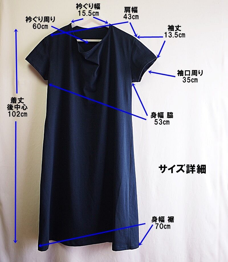 肩幅43㎝、袖丈13.5㎝のショートスリーブ、着丈は後中心で102㎝、身幅は脇で53㎝、裾周りが140㎝