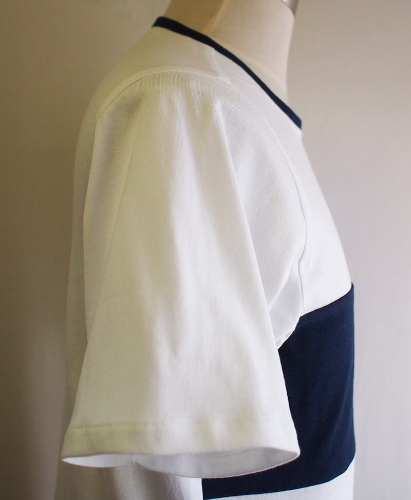 白と紺のスイッチングバイカラーでWIロゴアップリケのポケットT