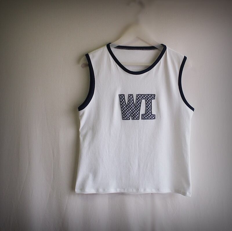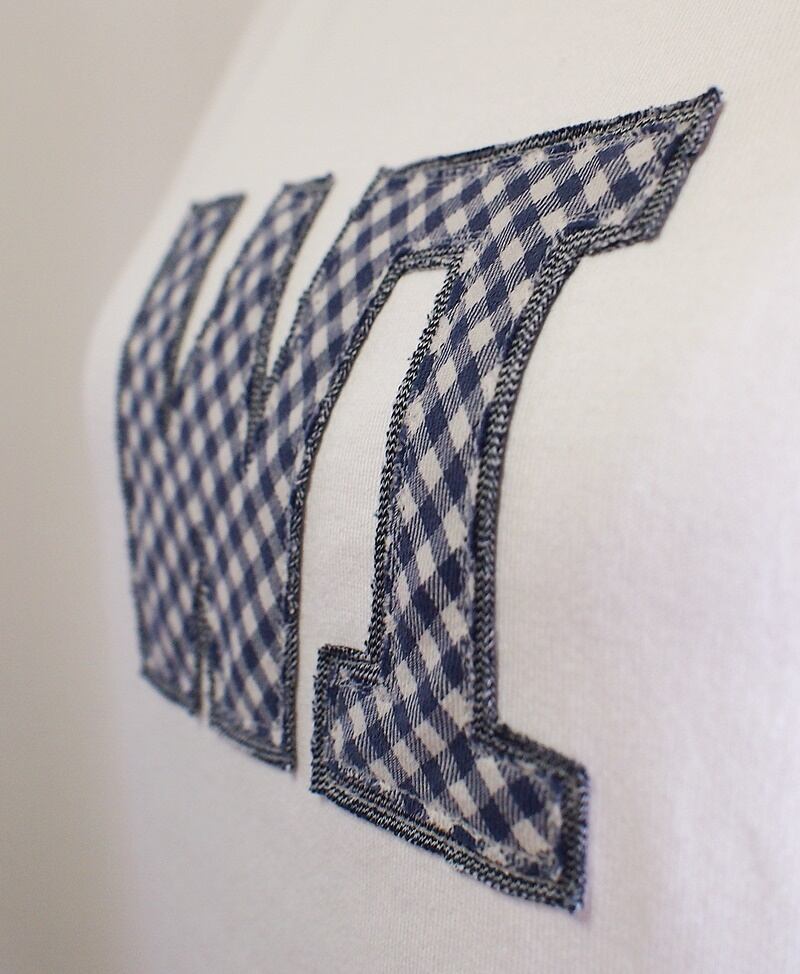 前身頃に優しい印象のWIロゴアップリケ、コットンポンチミジンコボーダーと白&ブルーのギンガムチェックをWIロゴにカット、生地端がほつれないよう二重にミシンステッチ、裁ち切りのままポケットへアップリケ