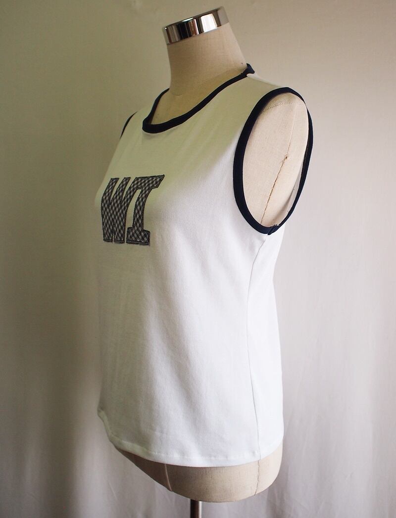 WIロゴアップリケを施した衿ぐりと袖ぐりがバイカラーのアメリカンスリーブT