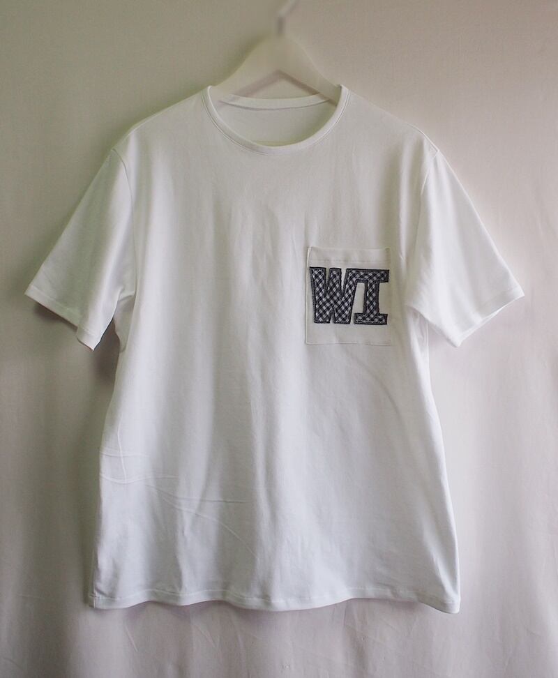 シンプルなクルーネックのポケットT、WIロゴアップリケをポケット幅ギリギリにレイアウト