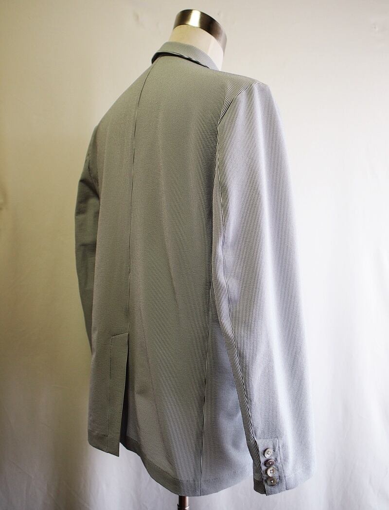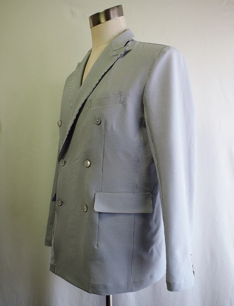 初秋におすすめなサラサラのストレッチシアサッカーでオンオフ使える普通に個性的なダブルブレストジャケットです。