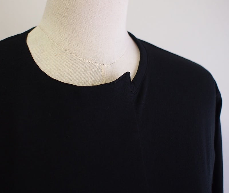 衿ぐりから裾へ前身頃左寄りに縦のシーム(接ぎ目)を入れたアシンメトリーネックラインのチュニック丈Tシャツ
