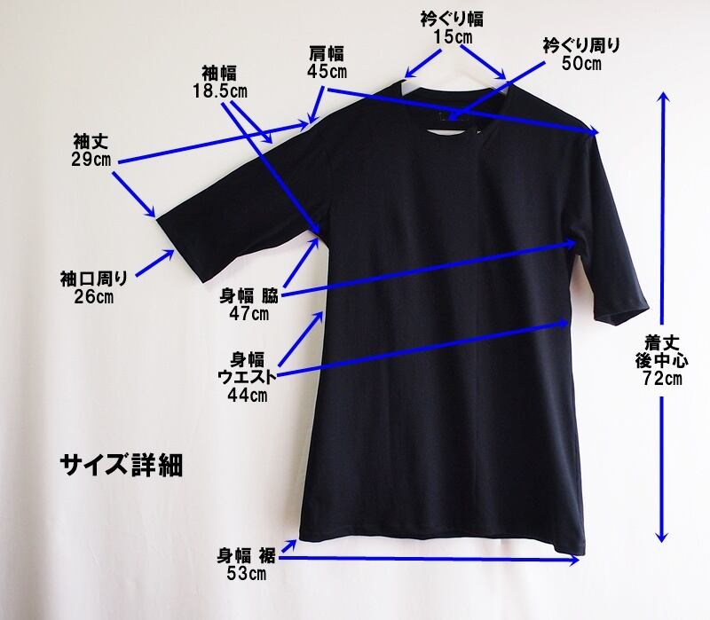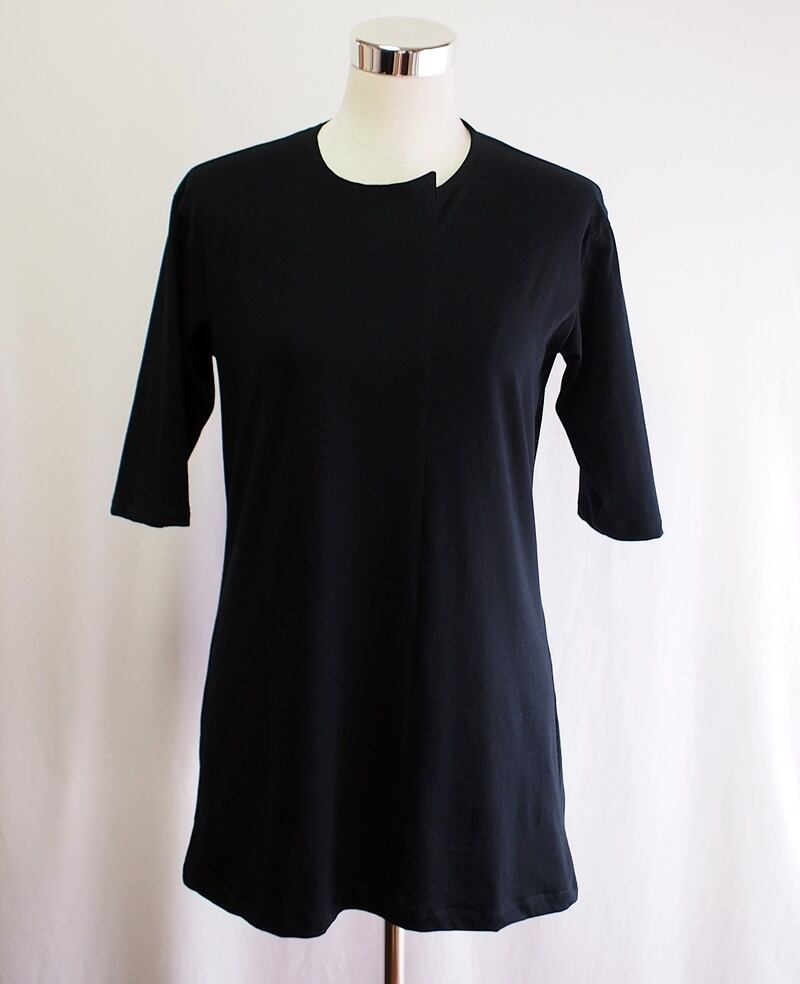 前回ご紹介した「オーガニックコットン 40/-天竺 ハーフスリーブ アシンメトリーネック ワンピース ブラック」こちらと同じ素材を使用したチュニック丈Tシャツ