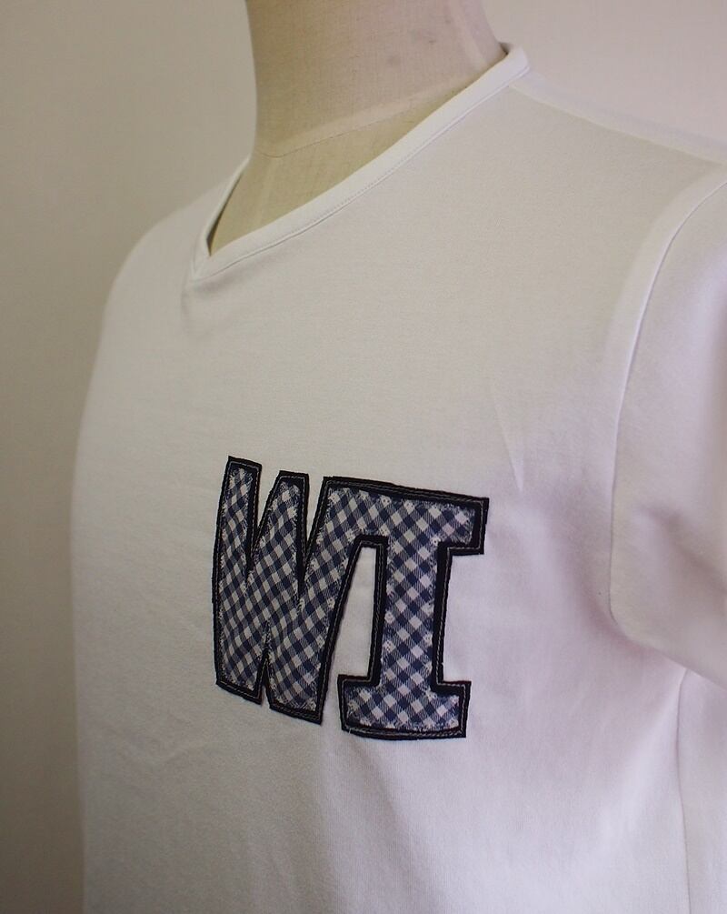 左胸には二つの素材を使用したワッペンのようなWIロゴアップリケ、ネイビーのクールドッツとバイヤスにカットした綿のギンガムチェックを裁ち切りのままWIロゴにカット、生地端がほつれないよう二重にミシンステッチ