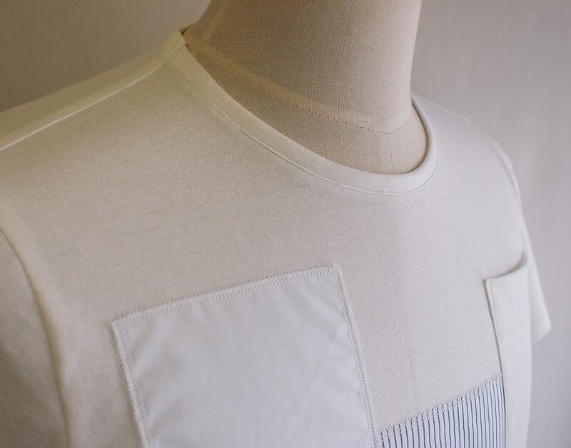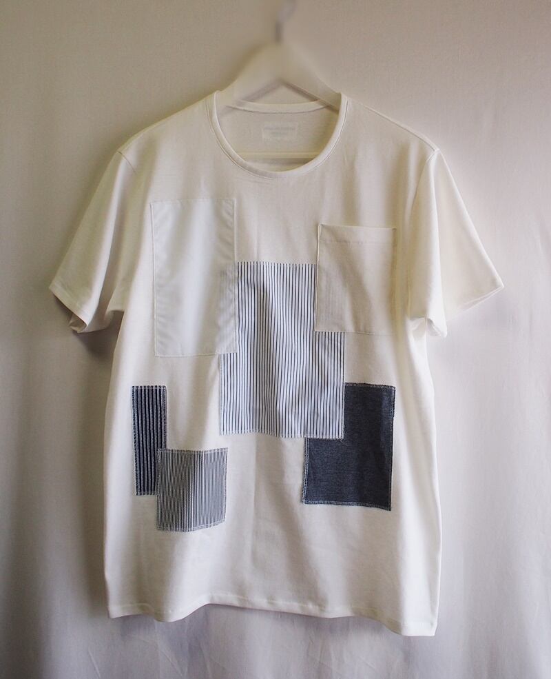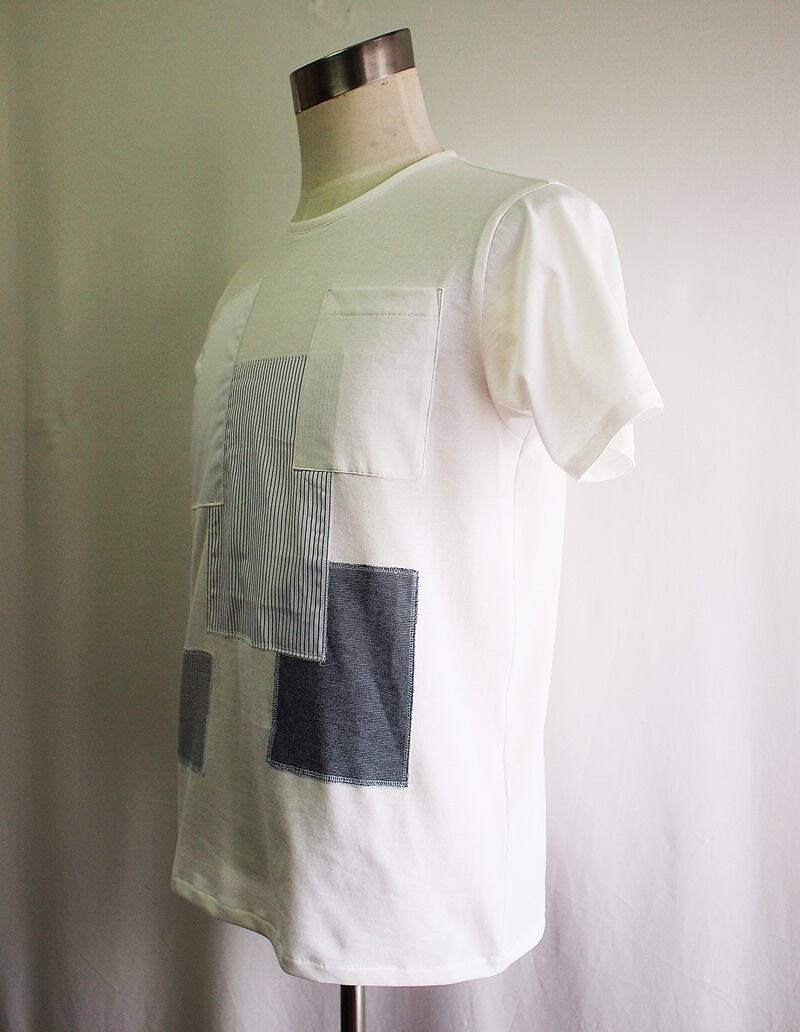 前回レディスでご紹介した「コットン 20天竺 スクラップ アップリケ アシンメトリーネック Tシャツ ホワイト」コチラと同じスクラップアップリケをしたクルーネックのポケットTシャツ