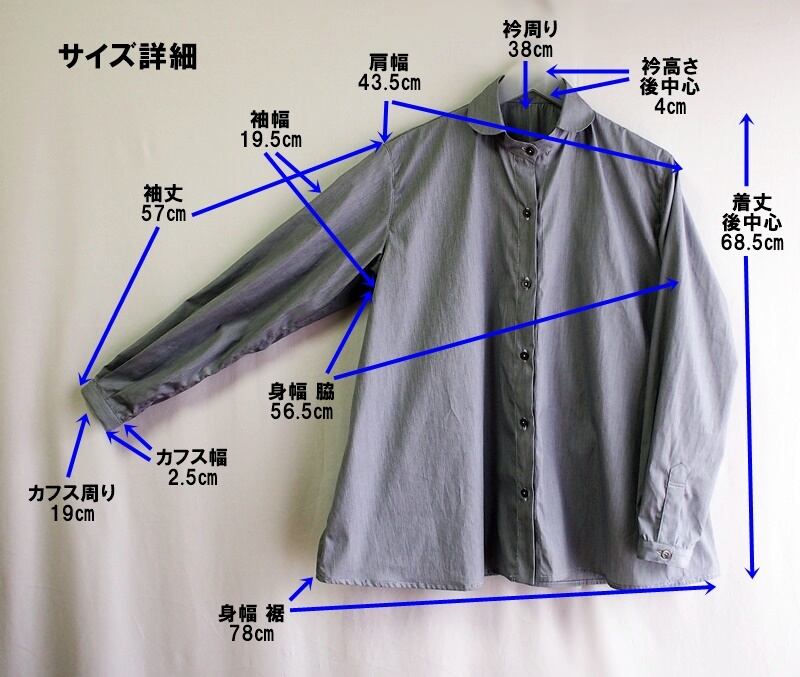 肩幅43.5㎝、袖丈57㎝、身幅は脇で56.5㎝、裾が78㎝、肩から裾へ広がるゆったりとしたトラペーズライン