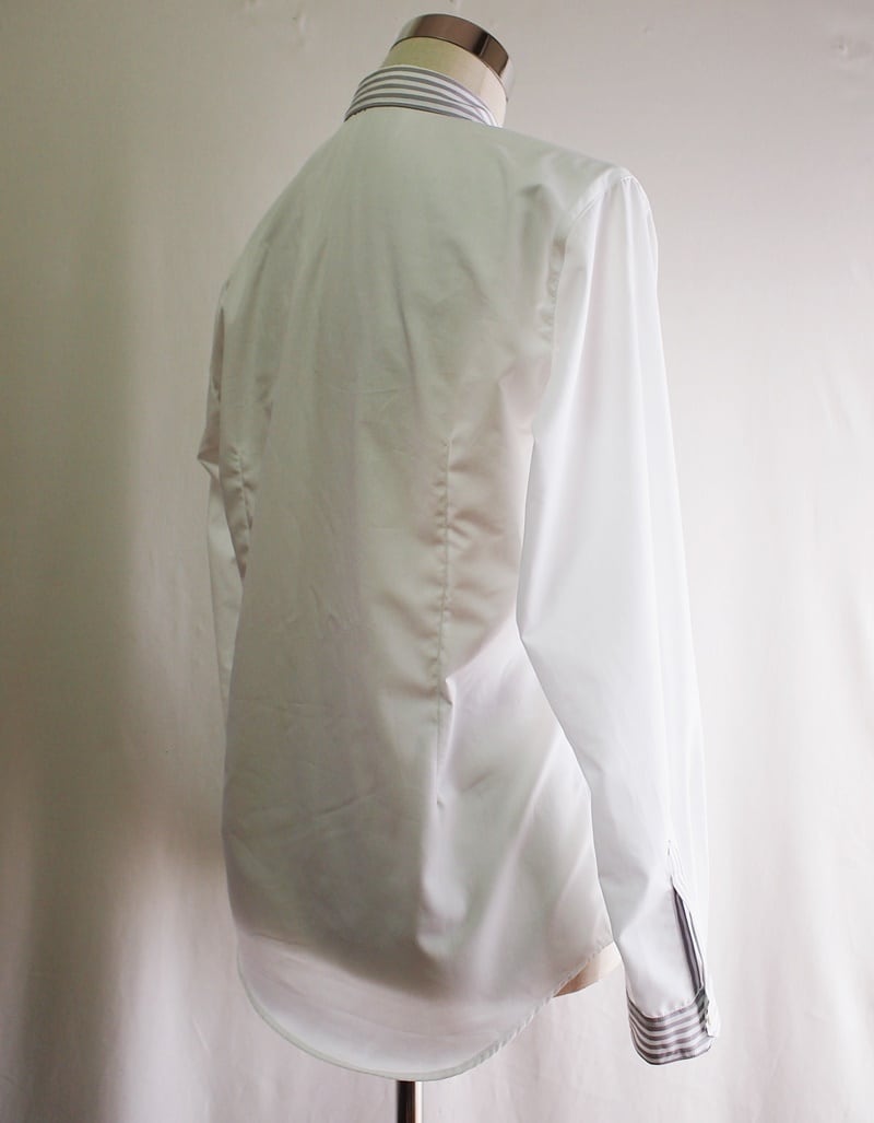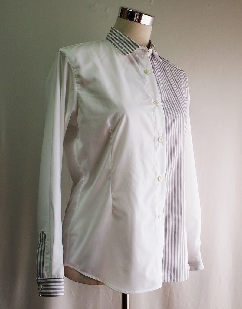 真っ白なコットンローンとロンドンストライプのコットンブロードでクレイジーパターンのシャツカラーブラウス