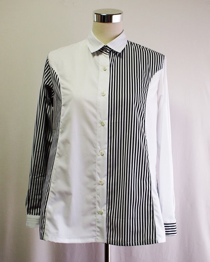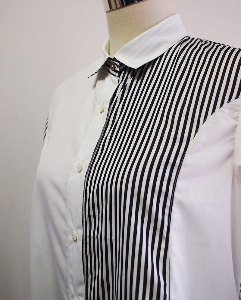 前回のメンズと同じく真っ白なコットンローンと白黒ロンドンストライプのコットンブロードで、10月28日にご紹介した「コットン80ローン&60/2ブロード クレイジーパターン パネルライン オーバーブラウス」こちらのブラウスのシルエットや袖などを修正、着丈も長くしています