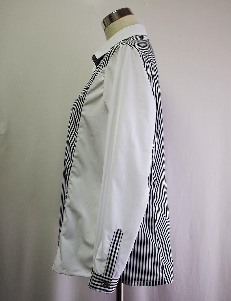 黒蝶貝(11.5㎜)を前中心第一ボタンと左袖口、前中心二つ目から下全てと右袖口には白い高瀬貝(11.5㎜)を使用、上衿裏と台衿表は白黒のロンドンストライプに統一