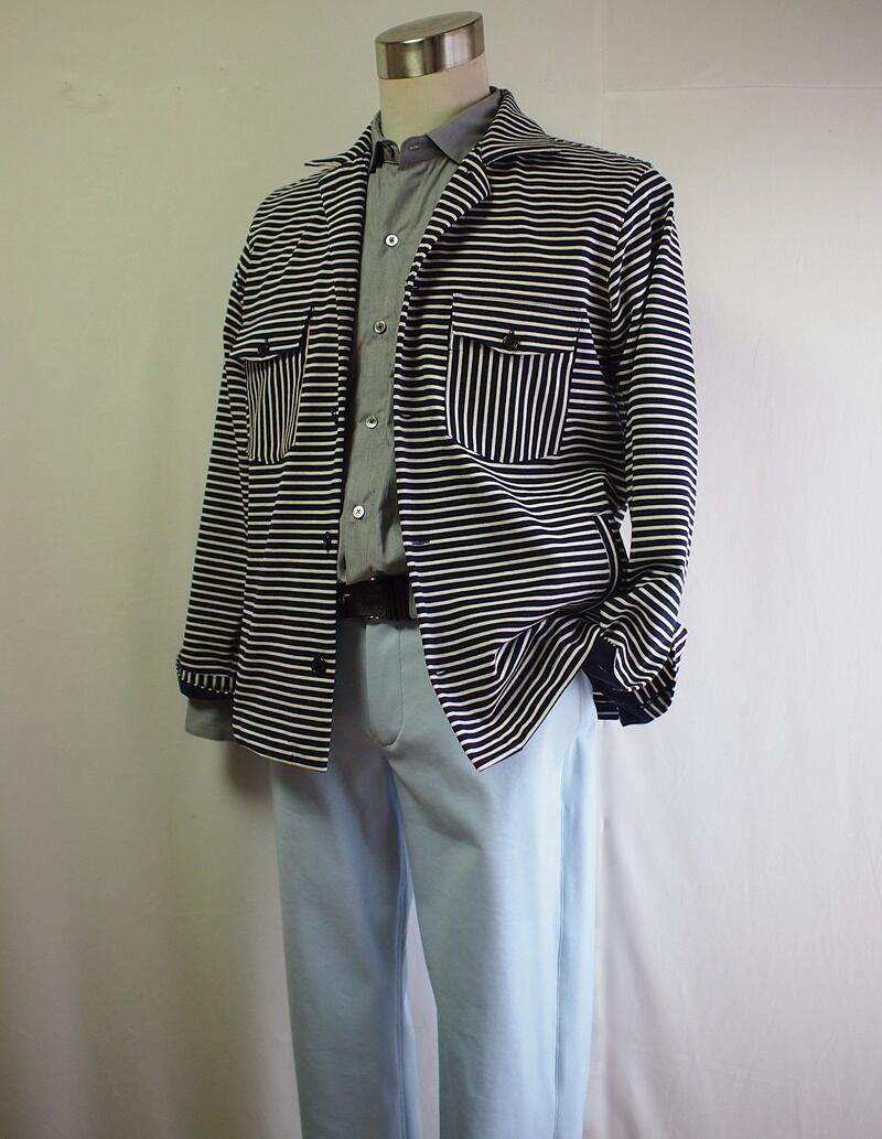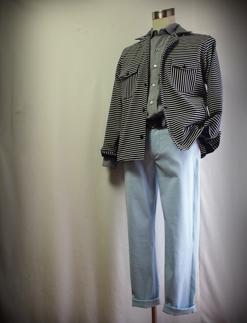 使用した素材は綿100%の60/2ブロードでグレー系の色合い、白とブラックで髪の毛のように細く無地のようなヘアラインストライプ