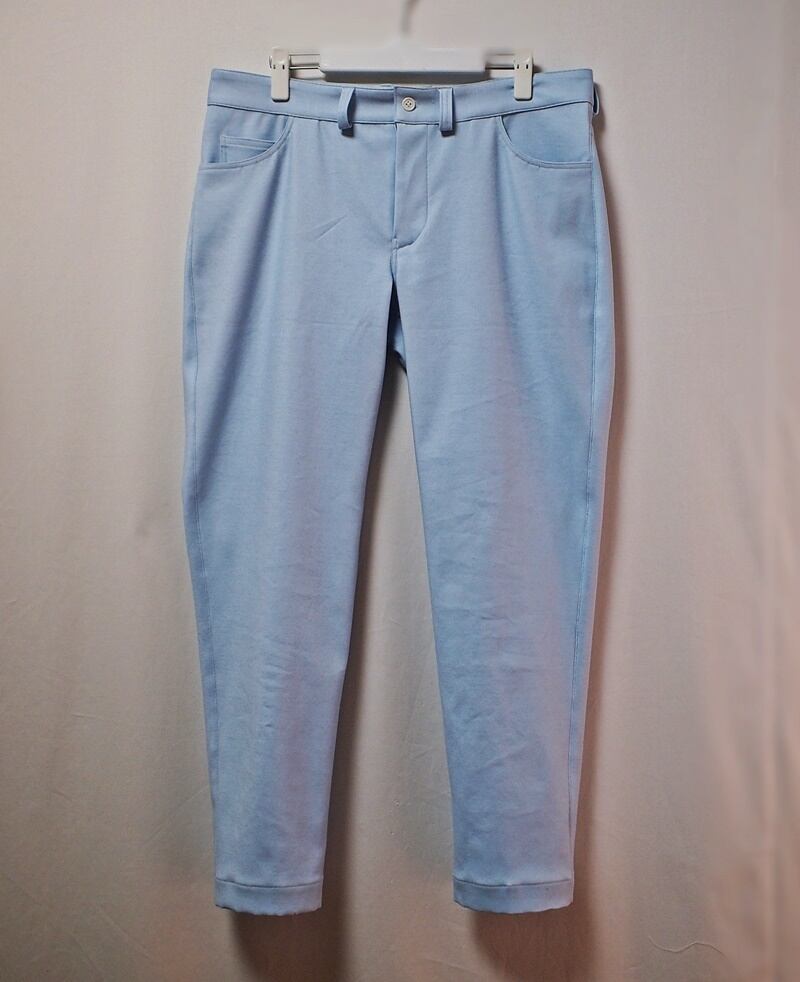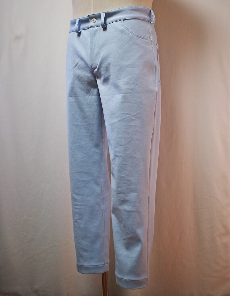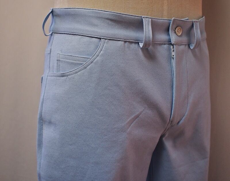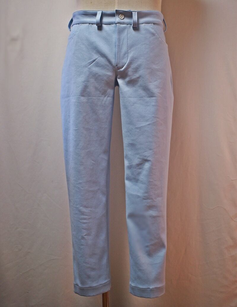 明るいサックスブルーの綿ポリウレタン混ストレッチツイルで快適な穿き心地、腰から裾へ細いシルエットの5ポケットテーパードパンツです。