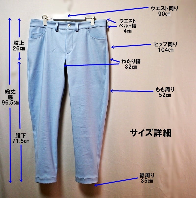 ウエスト周り90㎝、ヒップ周り104㎝、わたり幅32㎝、腿周り52㎝、裾周り35㎝